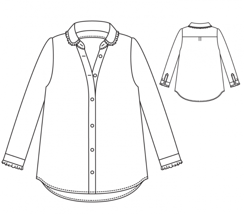 Le patron est parfaitement taillé pour avoir une coupe loose mais une ligne d’épaules bien dessinée. Le col possède deux options en version ronde avec froufrou ou pointue plus classique. La patte de boutonnage est également originale dans la manière de la concevoir tout en étant vraiment simple à réaliser. Les poignets de manches sont très propre grâce à des fentes capucine et un détail de froufrou pour s’accorder au col. D’ailleurs ces froufrous sont parfaitement dosés car ils ne sont pas trop volumineux, ce qui souligne simplement la ligne sans perturber le regard. Le dos possède également un joli pli plat pour garantir le volume et l’effet loose tant recherché.