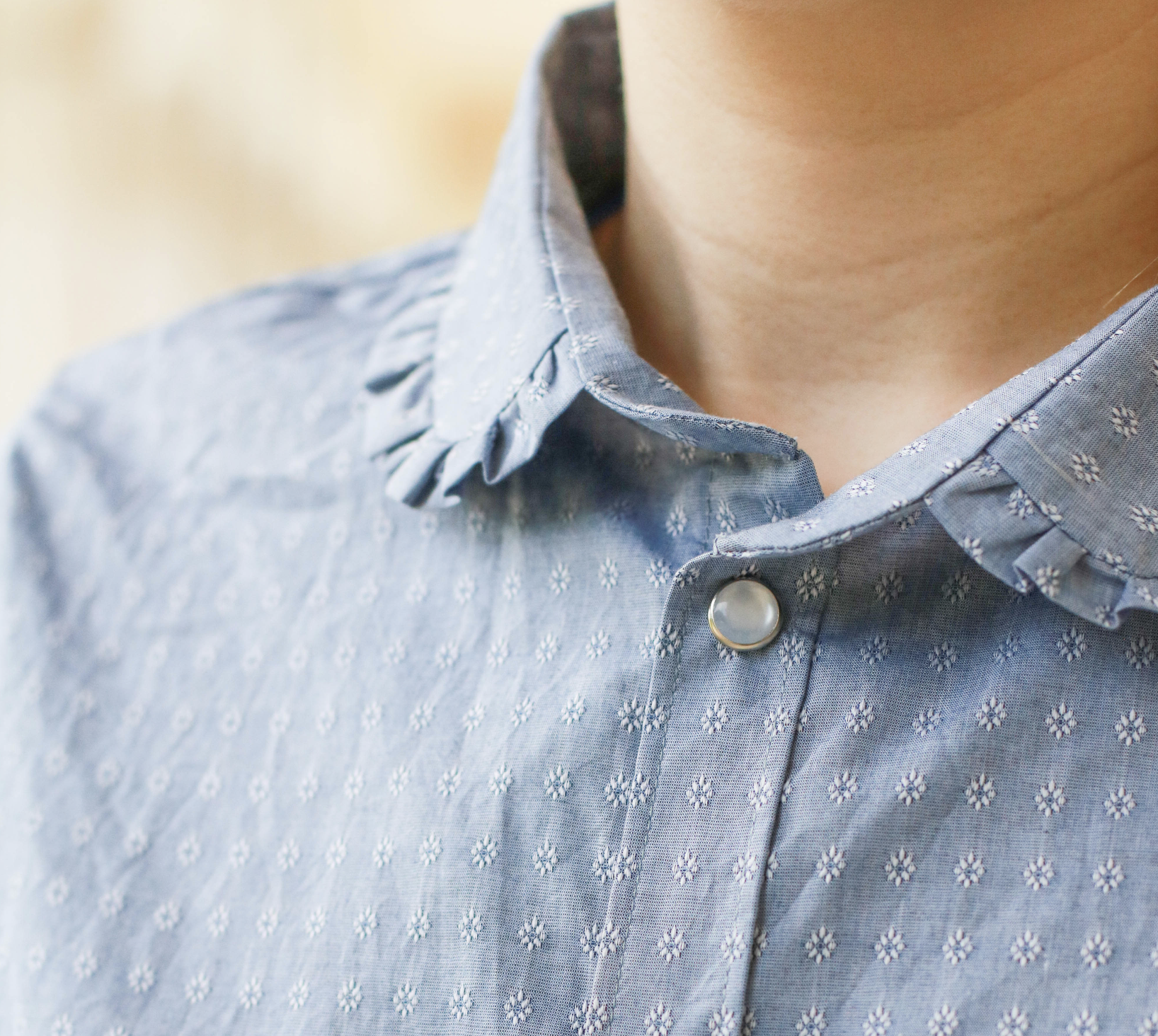 Pour fermer la chemise, j’ai opté pour des pressions nacrées qui se marie mnt parfaitement au tissu et ajouté un peu de modernité à l’ensemble.