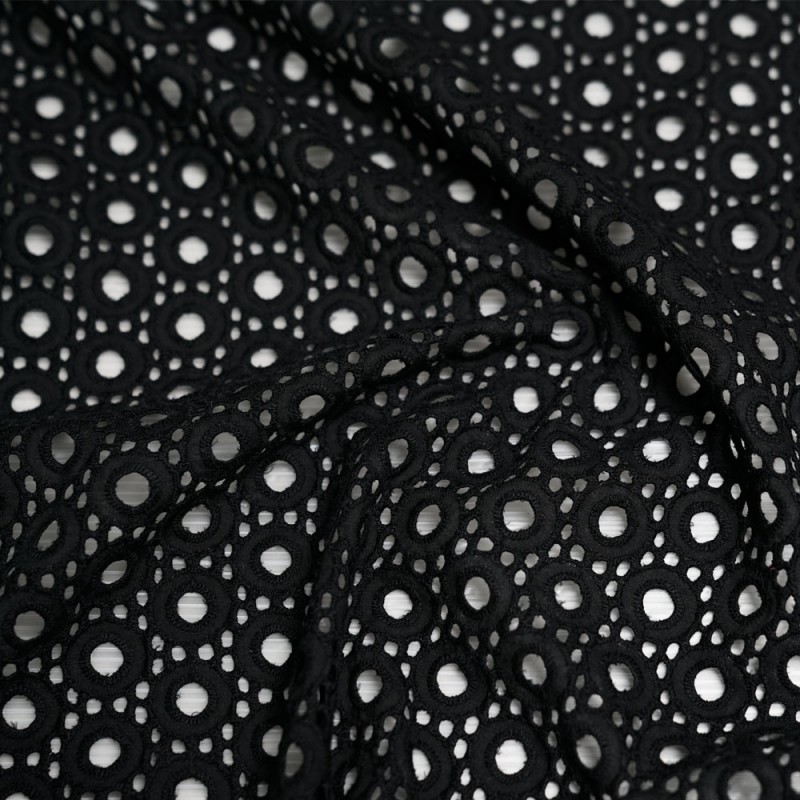 - PRETTY MERCERIE – Tissu coton brodé cercle ajourés 13,9€/m en laize 130cm