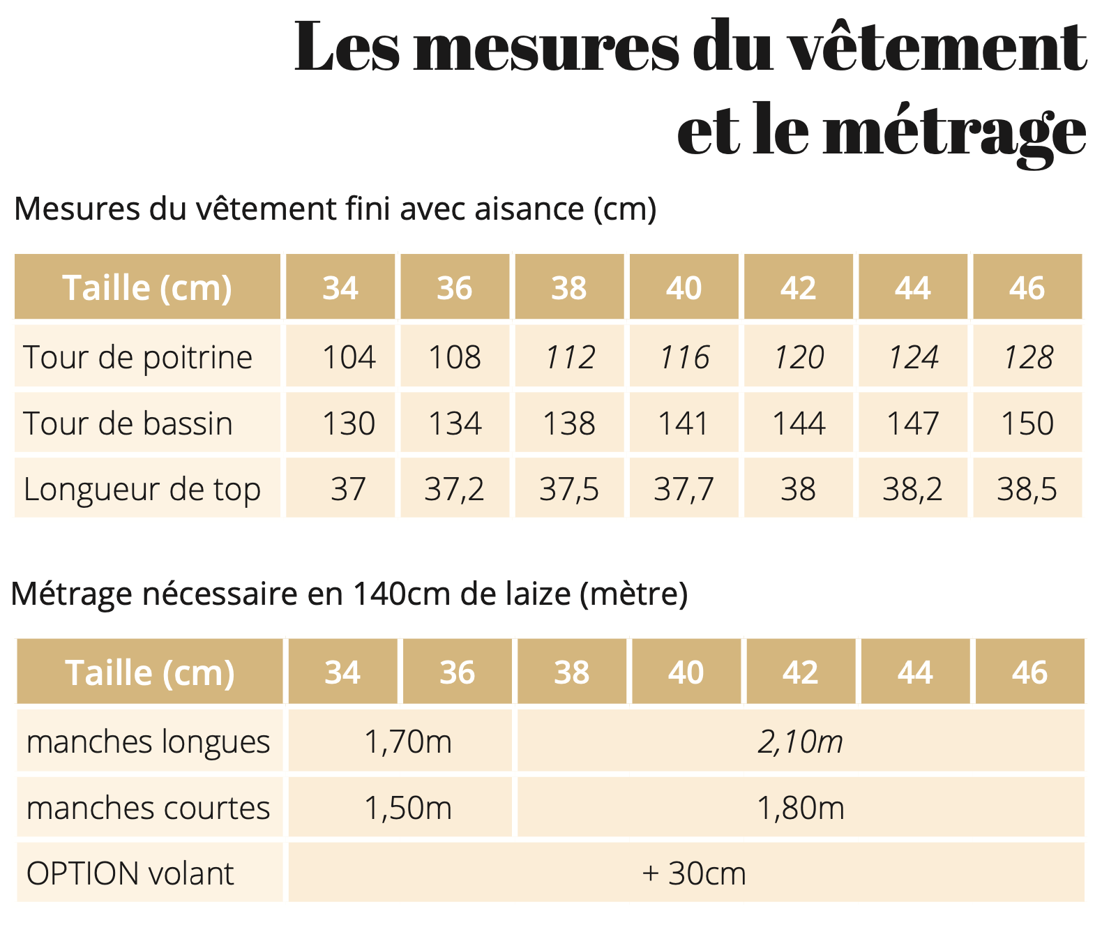 Optez pour des manches courtes ou longues et bouffantes avec un joli poignet noué avec ou sans la fantaisie du volant sur l’épaule. Son esprit flou et aérien sera idéal pour la belle saison à réaliser dans des tissus légers et fluide.