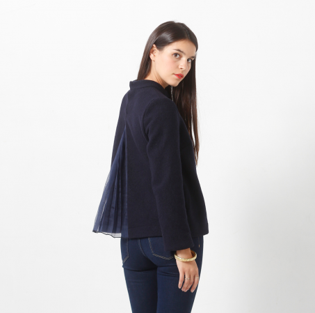 Toute l’originalité de Sirius réside justement dans son dos joliment travaillé qui m’a amené à jouer avec les contrastes et un plissé fin noir de chez 36 bobines. Et depuis j’imagine en coudre partout de ce plissé qui me fait tant craquer, mais je garde précieusement mon tissu pour une jupe ou une robe d’été car il est tout de même très fin et légèrement transparent.
