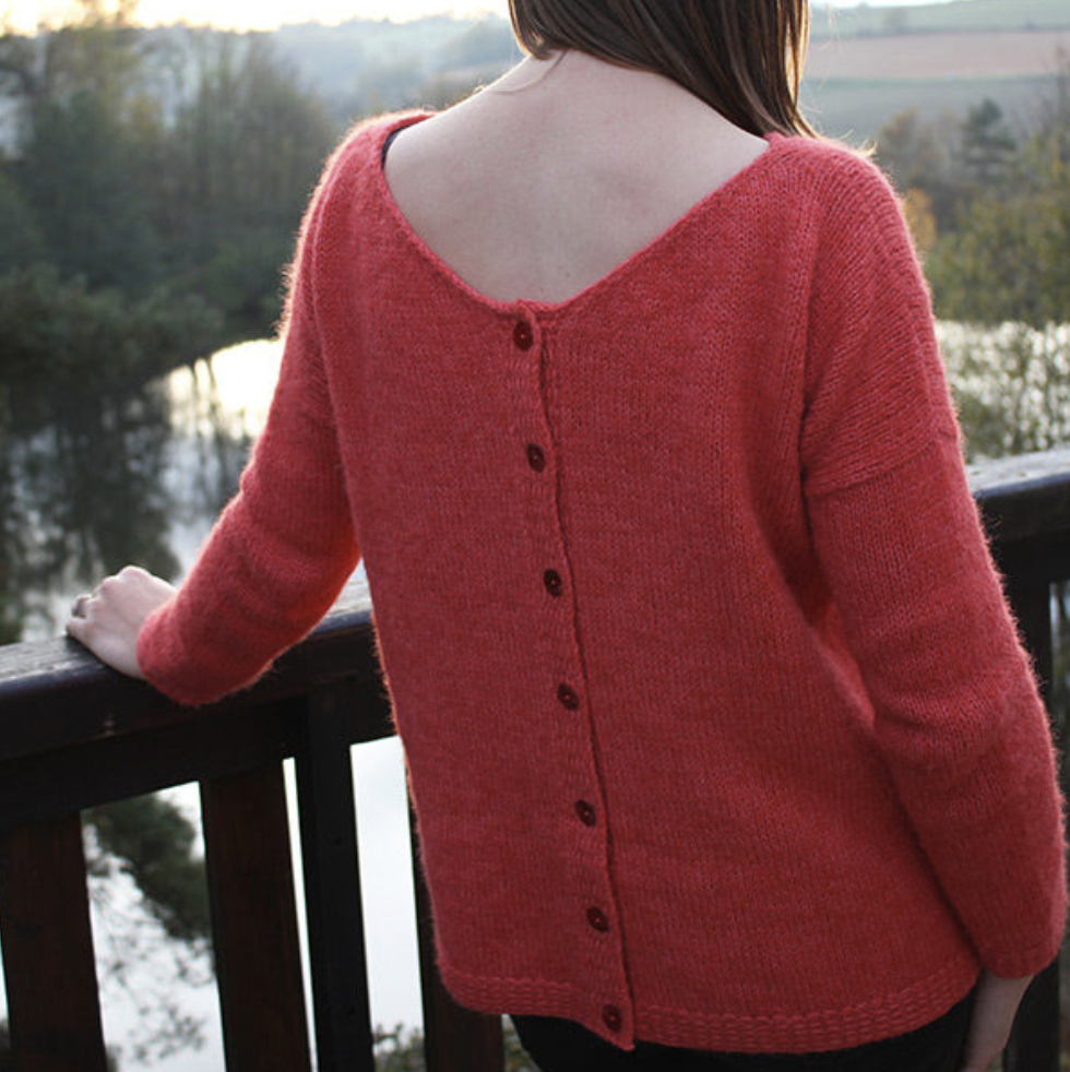 Pour celles qui ne connaissent pas encore le modèle Sur un nuage qui a beaucoup été partagé sur les réseaux sociaux l’année passée, il s’agit d’un pull ample de forme boîte avec un corps droit et des manches serrées et des épaules tombantes. Un petit V se dessine dans le dos et il y a normalement une patte de boutonnage tout au long du dos, car Sur un nuage est aussi un gilet que l’on peut porter des deux côtés. Un patron versatile qui s’adapte à vos envies.