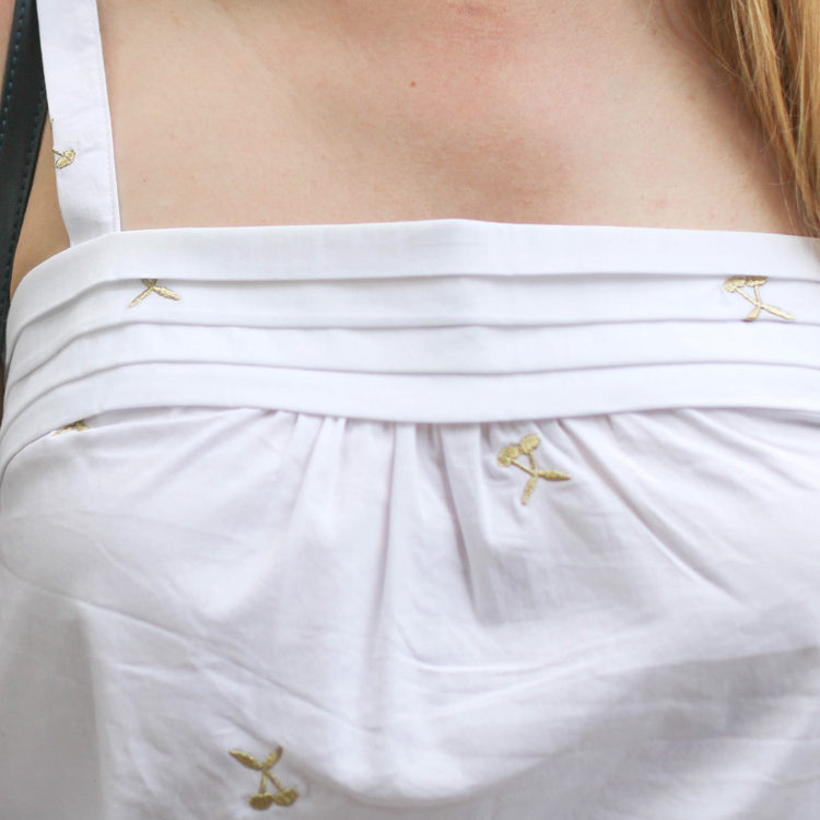 Pour tester le patron, j’ai remis la main sur un tissu de mon stock de l’été dernier, un coton fin avec un peu d’elasthane brodé de petites cerises or déniché chez Toto tissus. Légèrement transparent j’avais peur du rendu mais avec les plis sur la partie devant mais c’est finalement parfait.
